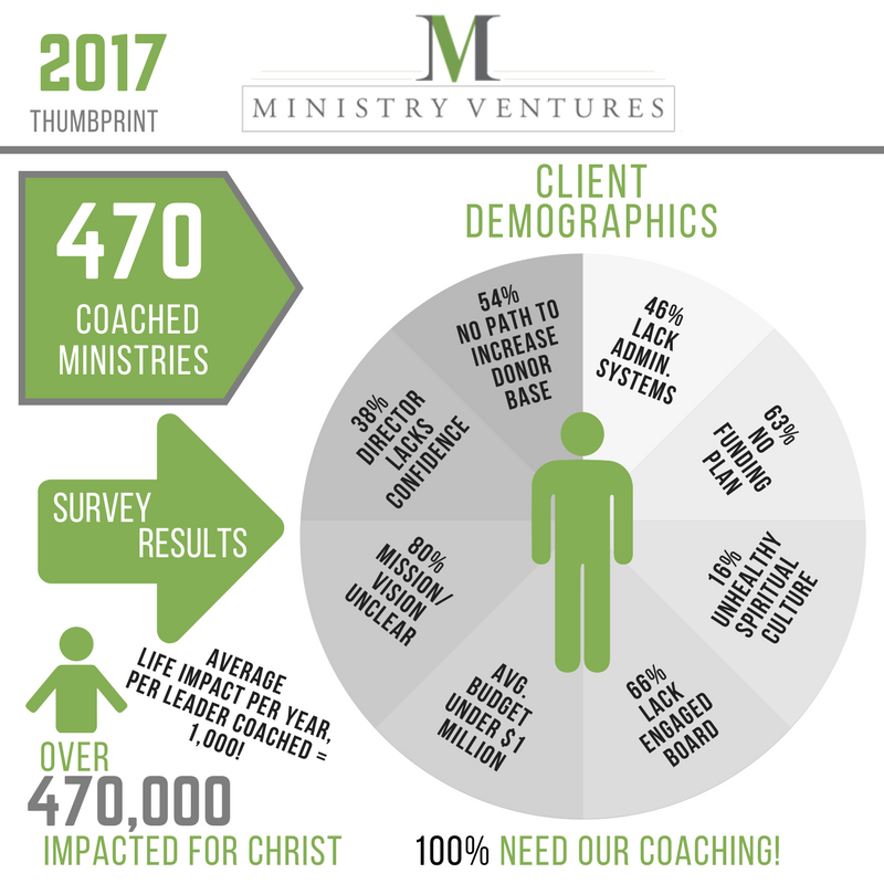 So many folks at risk. So many needs. So many ministry leaders with big hearts and a passion for making a difference. So many terrific ministries and services facing tremendous challenges day in and day out just to be able to stay engaged with our challenging world. Survey results from 470 Ministry Ventures coached ministries reported the following demographics. • 80% Mission/Vision Unclear • 38% Director Lacks Confidence • 54% No Path to Increase Donor Base • 46% Lack Administrative Systems • 63% No Funding Plan • 16% Unhealthy Spiritual Culture • 66% Lack Engaged board • Average Budget Under $ 1 Million Ministry Ventures has a passion for serving folks who may be dealing with the above challenges, who may be facing serious day to day struggles or who may have a sense of being overwhelmed. Opportunities to participate in Ministry Ventures Executive coaching groups are now available at early bird rates with the first session to occur in late April. Please give me a call at 847-997-7471 for further details about this exciting opportunity. Blessings on you! Ric Olson Certified Coach Ministry Ventures ROlson@ministryventures.org 847-997-7471